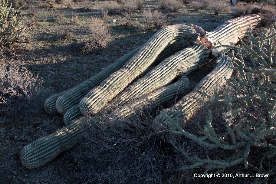 Силе природе су неуморне. Чак и дивови не могу да пркосе вечно. Сагуаро кактус нема изразито развијен коренов систем. Ипак, када киша коначно падне у стању је да прикупи огромну количину воде за сушне дане. Велики примерци могу после кише да теже и преко 6 тона. Превише воде, расквашено тло и слаб корен - комбинација која узима свој данак.